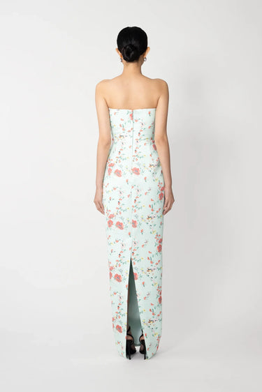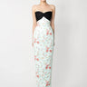 Floral printed satin twill column dress with contrast satin bow-shaped bust