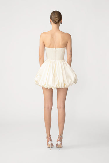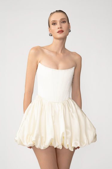 The Lydia Dress is a modern strapless ballerina mini featuring a fitted corset bodice with a softly puffed bubble skirt. Crafted in glossy satin, its clean lines and controlled volume create a playful yet polished silhouette—perfect for special occasions.