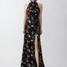 Satin Cheongsam gown with a halter top a Mandarin collar featuring decorative pankou buttons and a thigh-high slit