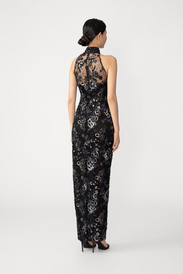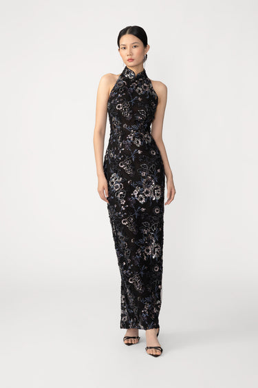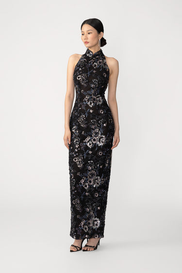 The Arielle Dress is a modern embroidered mesh cheongsam with halter neckline adorned with beading and shimmering sequins in a striking abstract motif. Comes with a slip for full coverage.