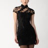 The Charlie Dress is a sheer, mini modern cheongsam adorned with intricate floral embroidery and beading. A bold statement piece for any party, it comes with an optional slip dress for added coverage.