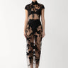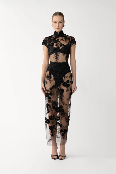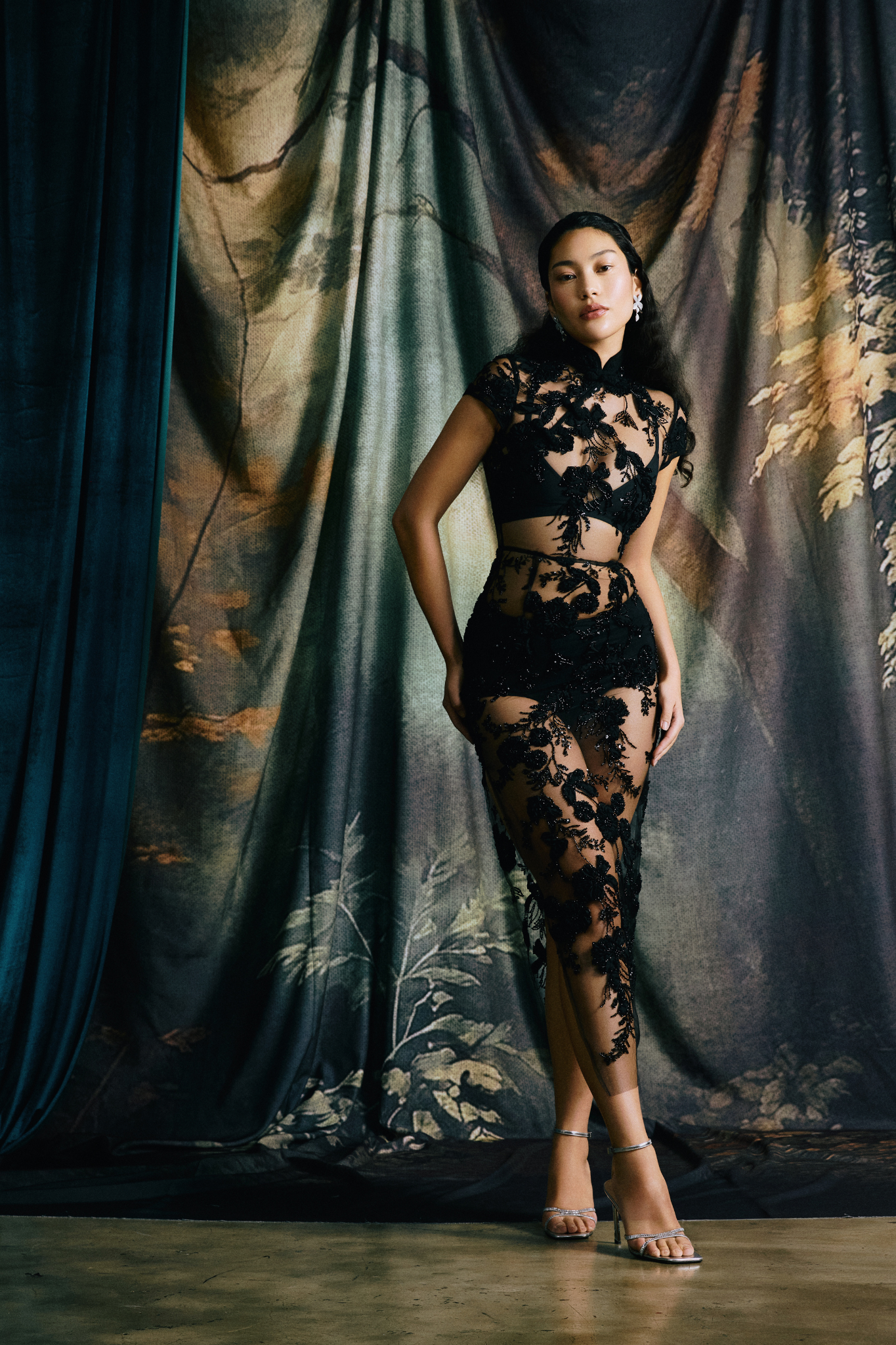 The Charlize Dress is a cheongsam crafted in mesh and adorned with floral sequin beading. Featuring a mandarin collar and hand-tied pipa knots along the neckline, it comes with a separate slip dress.
