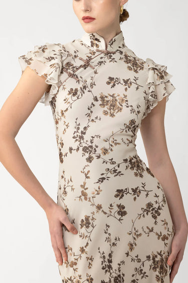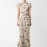 The Gemma Dress is cut from flowing chiffon in a vintage cream floral print. A subtle nod to the cheongsam featuring a mandarin collar, contrast piping, and hand-tied pipa knots.