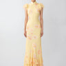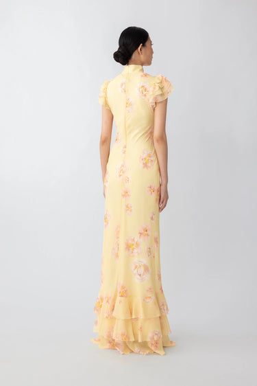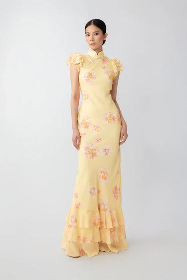 Chiffon bias-cut Cheongsam maxi dress with ruffled sleeves and a Mandarin collar