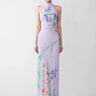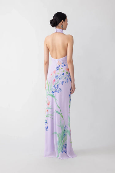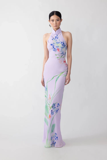 Backless chiffon Cheongsam dress with a bias-cut maxi skirt and a Mandarin collar featuring our signature hand-tied pipa knot button detail