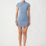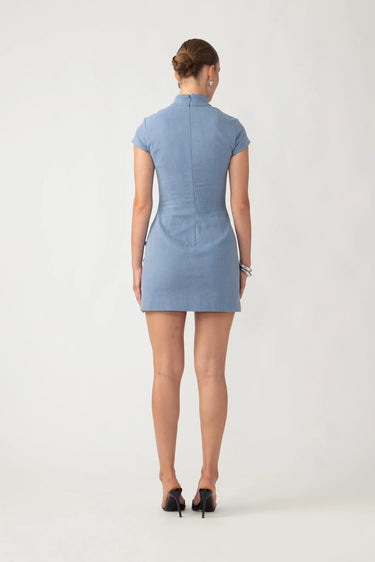 The Isa Denim Dress is a soft denim mini cheongsam, finished with signature hand-tied pipa knots—perfect for daytime and outdoor occasions.