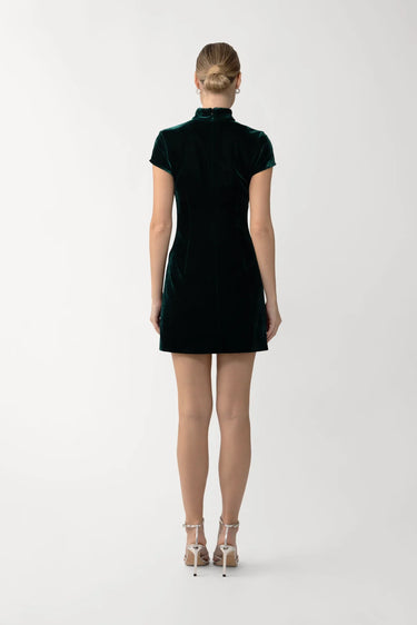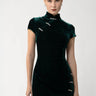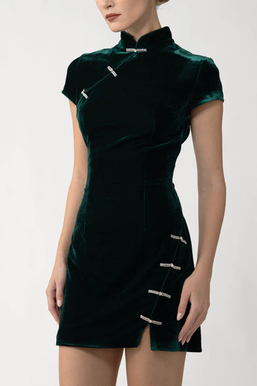 The Ivy Velvet Dress is a cheongsam silhouette cut from luxurious velvet. Detailed with a mandarin collar and crystal pankou buttons for a refined finish.