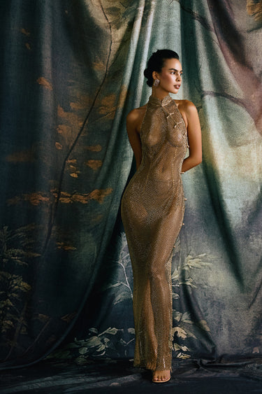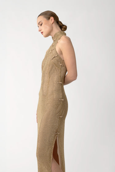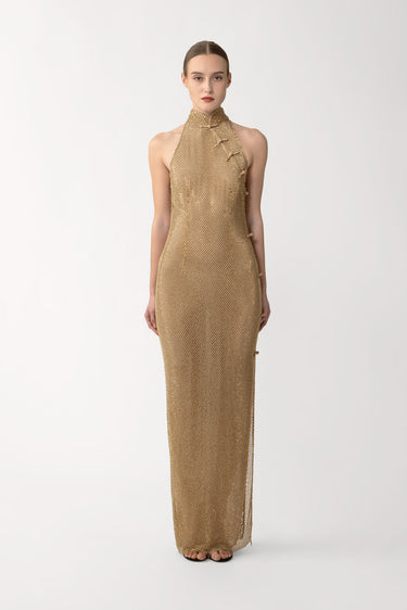 The Santana Dress is a floor-length gown embellished with crystals. Featuring a cheongsam-inspired silhouette with a mandarin collar and hand-tied pipa knots along the side. Comes with a matching slip.