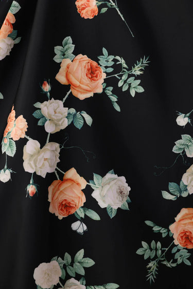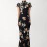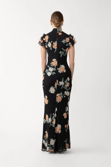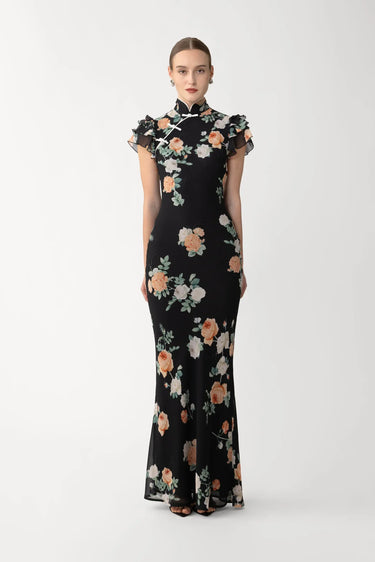Cut for a flattering shape from flowing chiffon, the Stella Dress features a mandarin collar, contrast piping, and hand-tied pipa knots — completed by our original peach and ivory roses print.