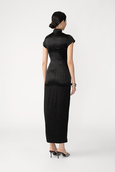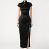 The Tamara Dress is a satin modern cheongsam with a mandarin collar, capped shoulders, and an asymmetrical slit at the collar and up the opposite thigh featuring mini velvet bows for a playfully festive touch.