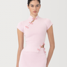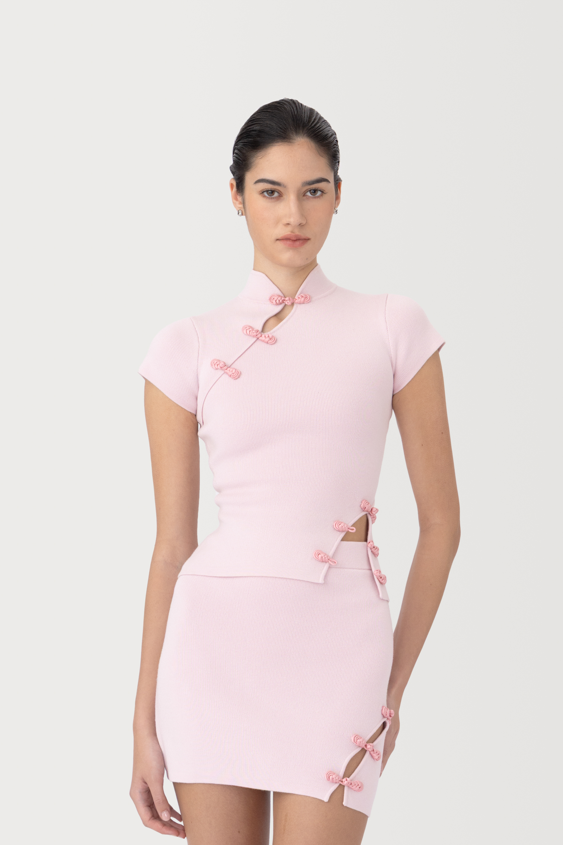 The Chase top is crafted from a soft viscose knit, featuring a cheongsam inspired design with cap sleeves and a contemporary front slit. The hand-tied pipa knots adds artisanal charm, making this piece a versatile wardrobe essential. It pairs seamlessly with the matching Chase knit skirt for a coordinated look.