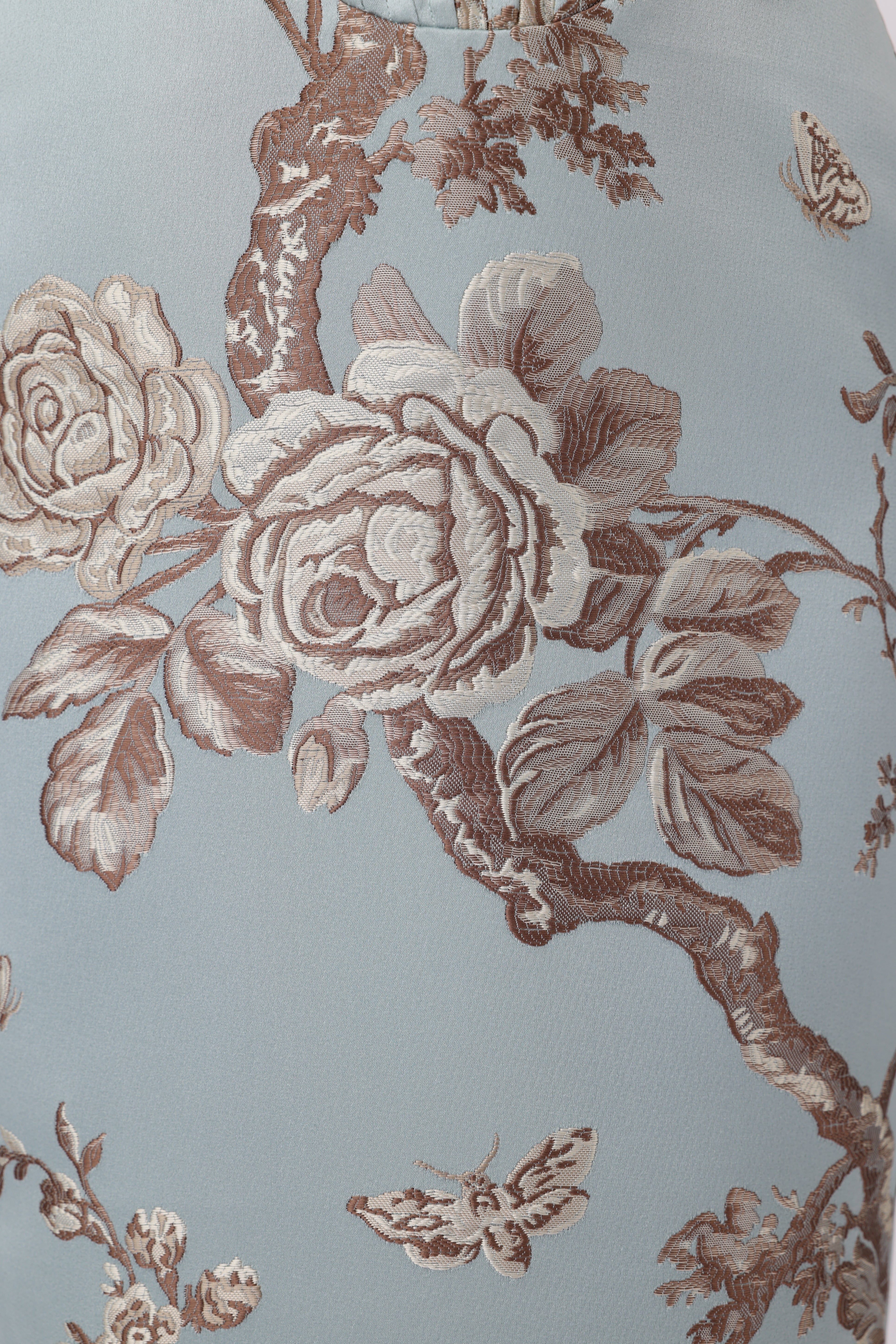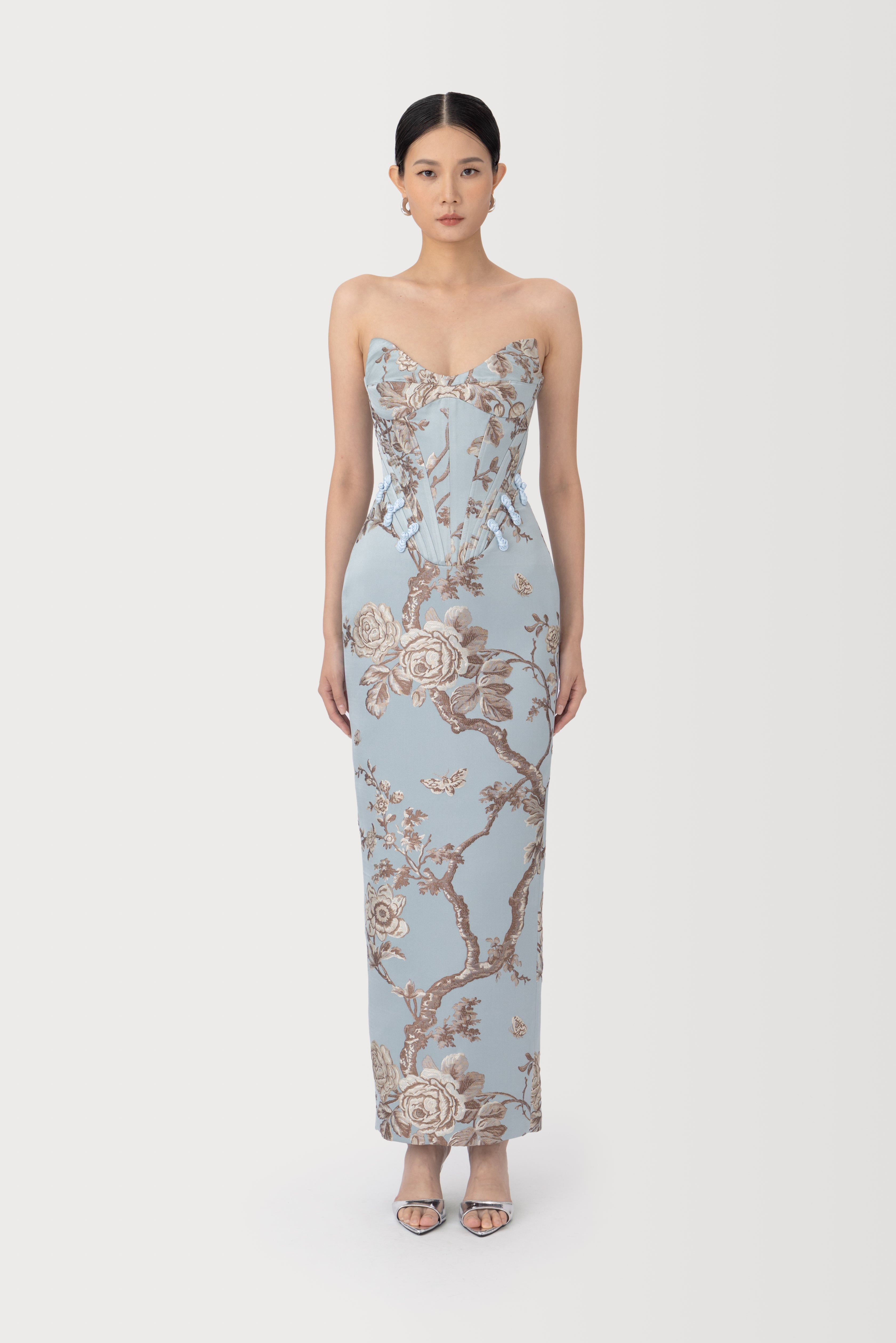 The Novella brocade dress is a strapless maxi gown in luxurious peony inspired brocade. Its sweetheart neckline elegantly frames the décolletage, while the bustier bodice offers structure and support for a sculpted fit. Lined with our signature contrast satin hand-tied pipa button detailing the Novella is a unique and modern style.