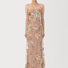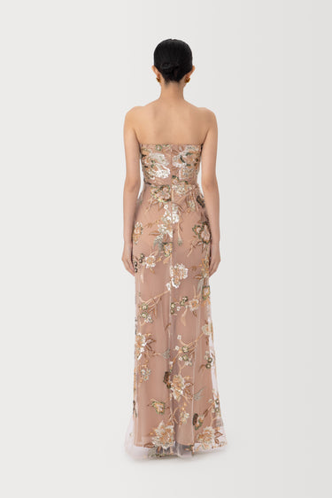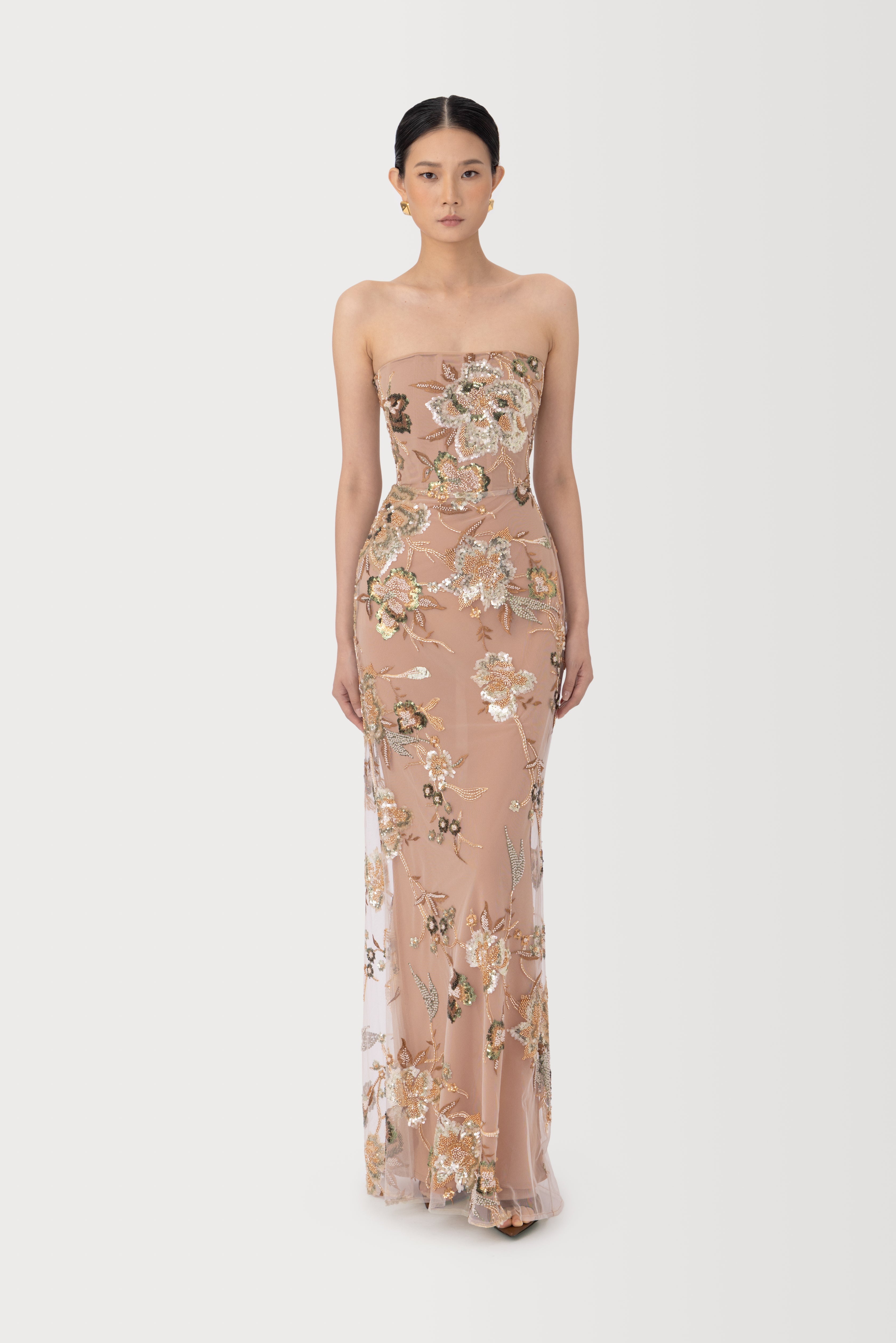 The Pippa dress is a strapless maxi gown crafted from delicate mesh with peony motifs, intricately adorned with sequins and beads. Its built-in structured corset-style bodice sculpts the body for an hourglass silhouette.