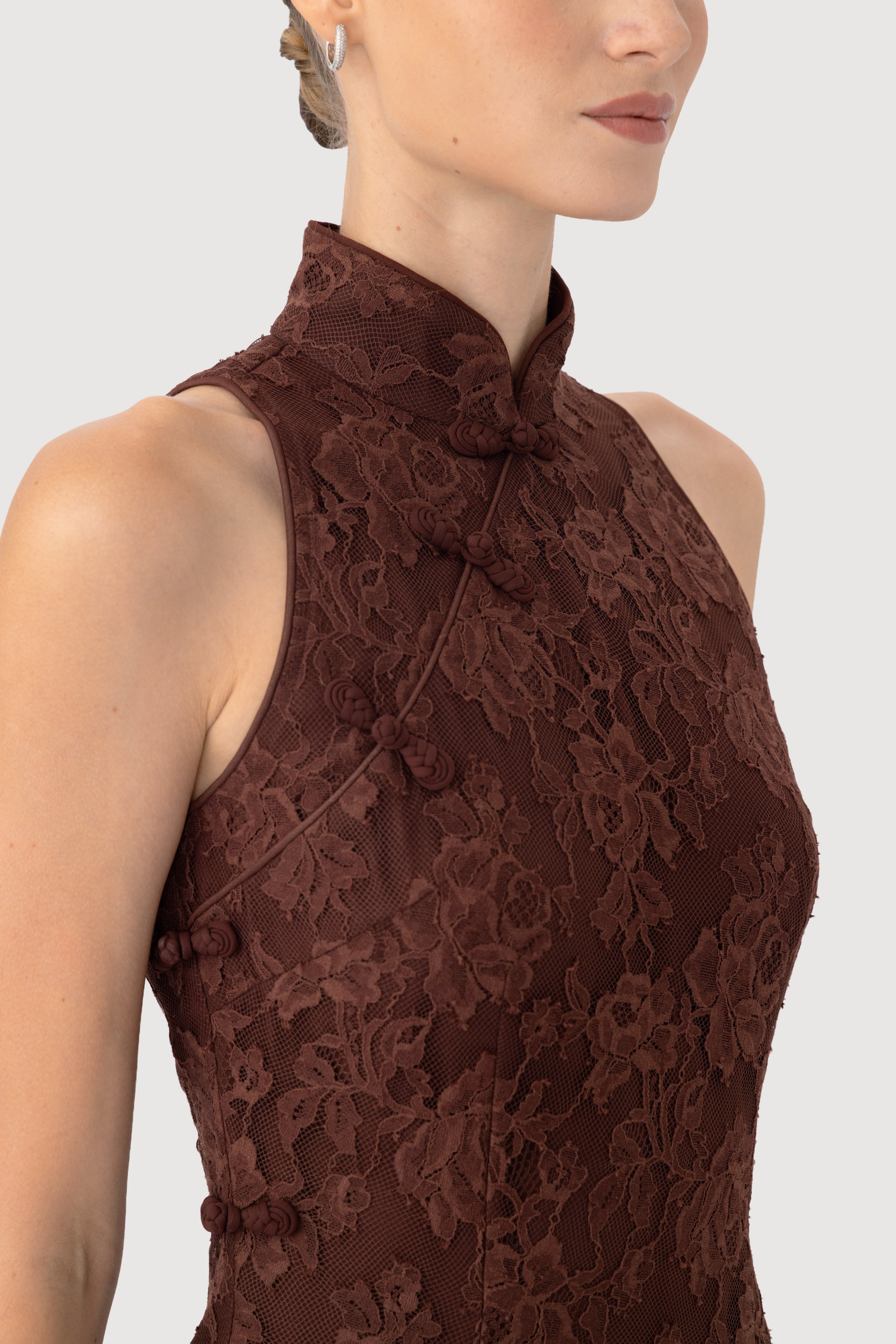 The Silba lace dress is a cheongsam inspired mini, crafted from cotton-mix chantilly lace. It features a delicate scallop edge along its asymmetric hem, with hand-tied pipa knots providing a distinct touch.