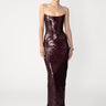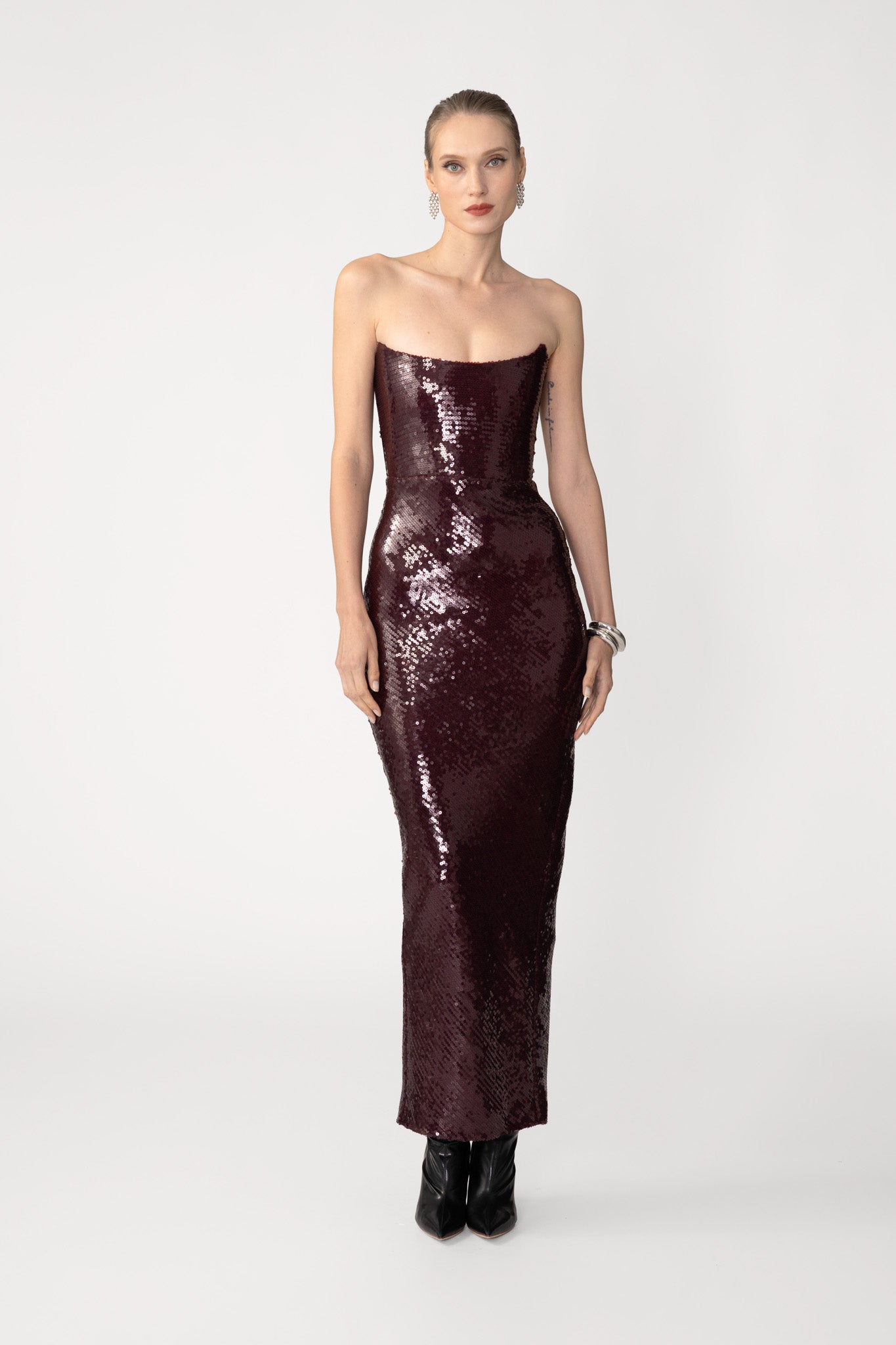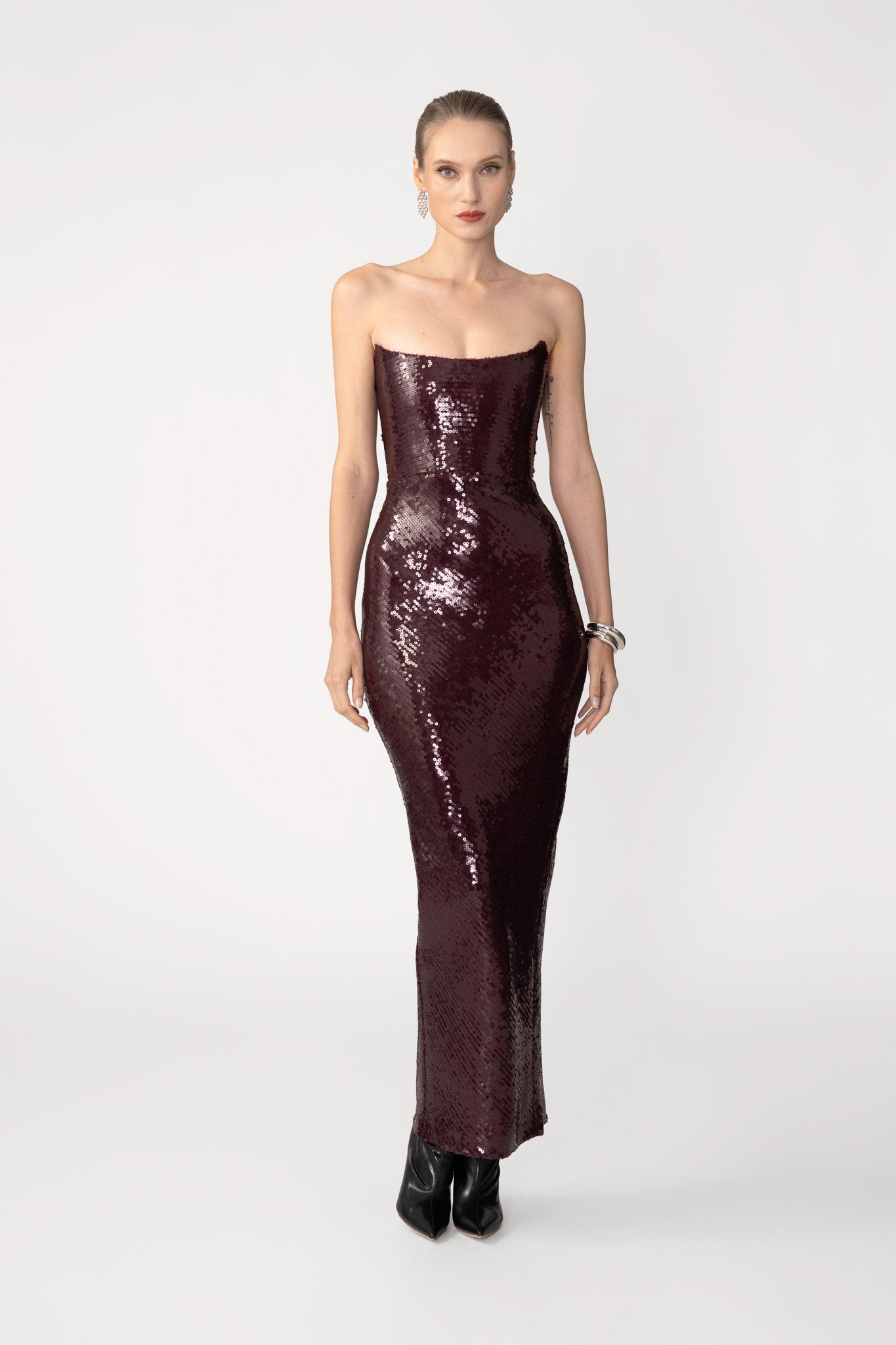 The Venus Dress is a strapless pencil silhouette featuring densely sewn sequins over a corset bodice and a fitted, full-length skirt with a slight stretch to accentuate a classic hourglass shape and shine all evening.