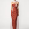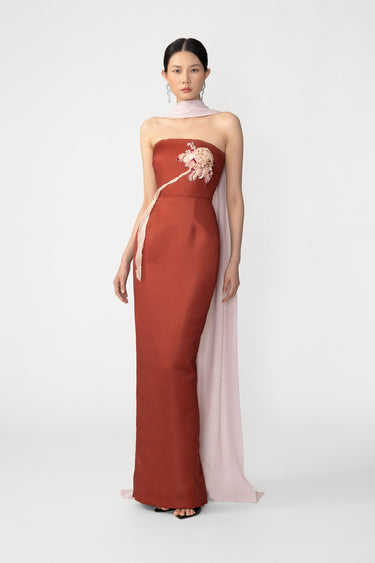 The Cherrie Gown is a modern classic column silhouette that makes a statement with its asymmetrical chrysanthemum appliqué over a fully boned bodice.