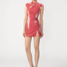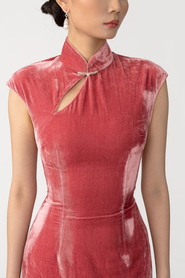 The Dawn Dress is a velvet mini modern cheongsam featuring a mandarin collar, a keyhole cut-out, and a subtle thigh slit. A crystal pankou button adds a touch of sparkle for day or evening parties.
