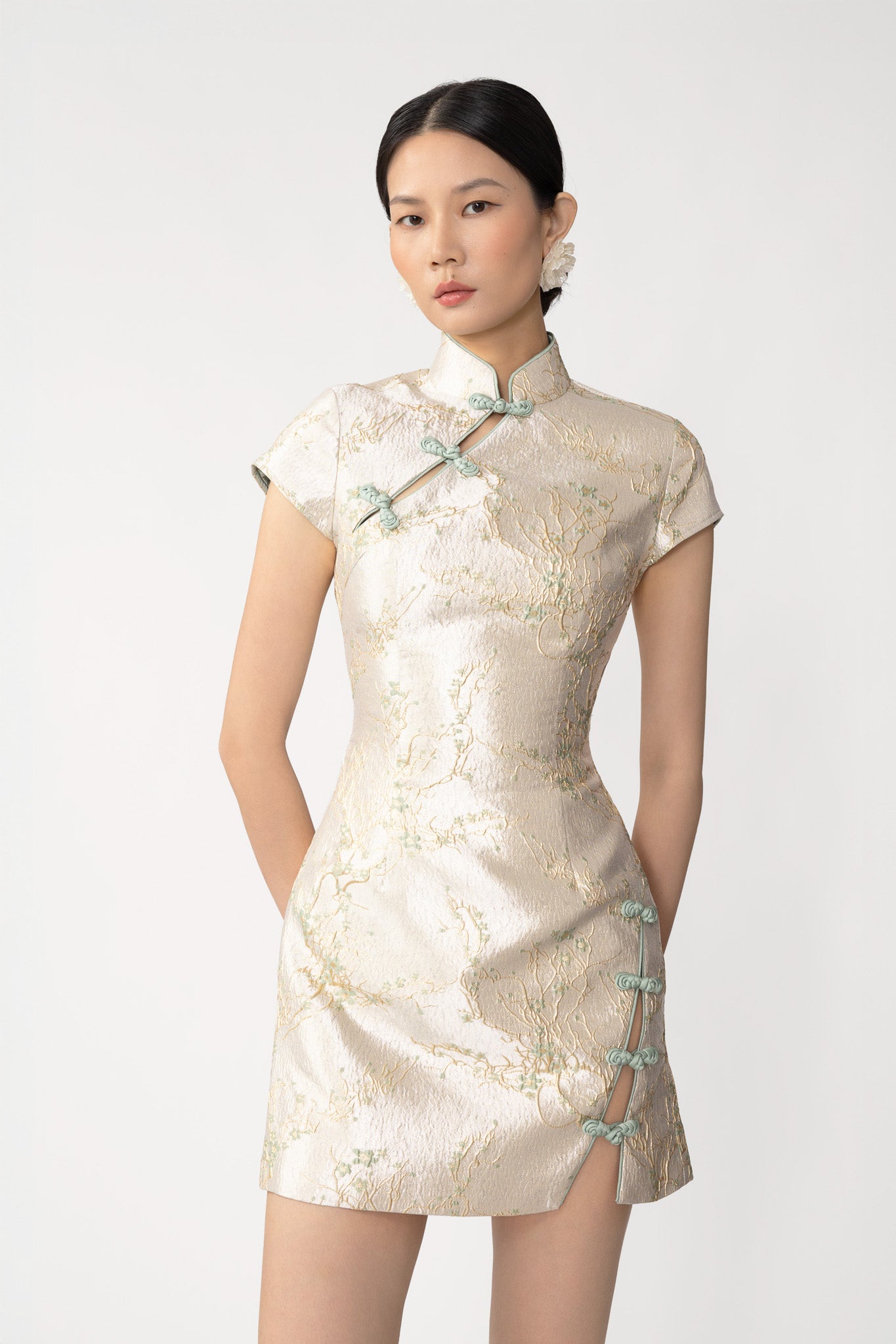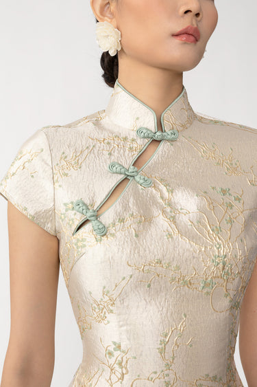 Modern Cheongsam jacquard mini dress with cap sleeves and a Mandarin collar featuring our signature hand-tied pipa knot detail
