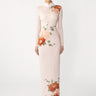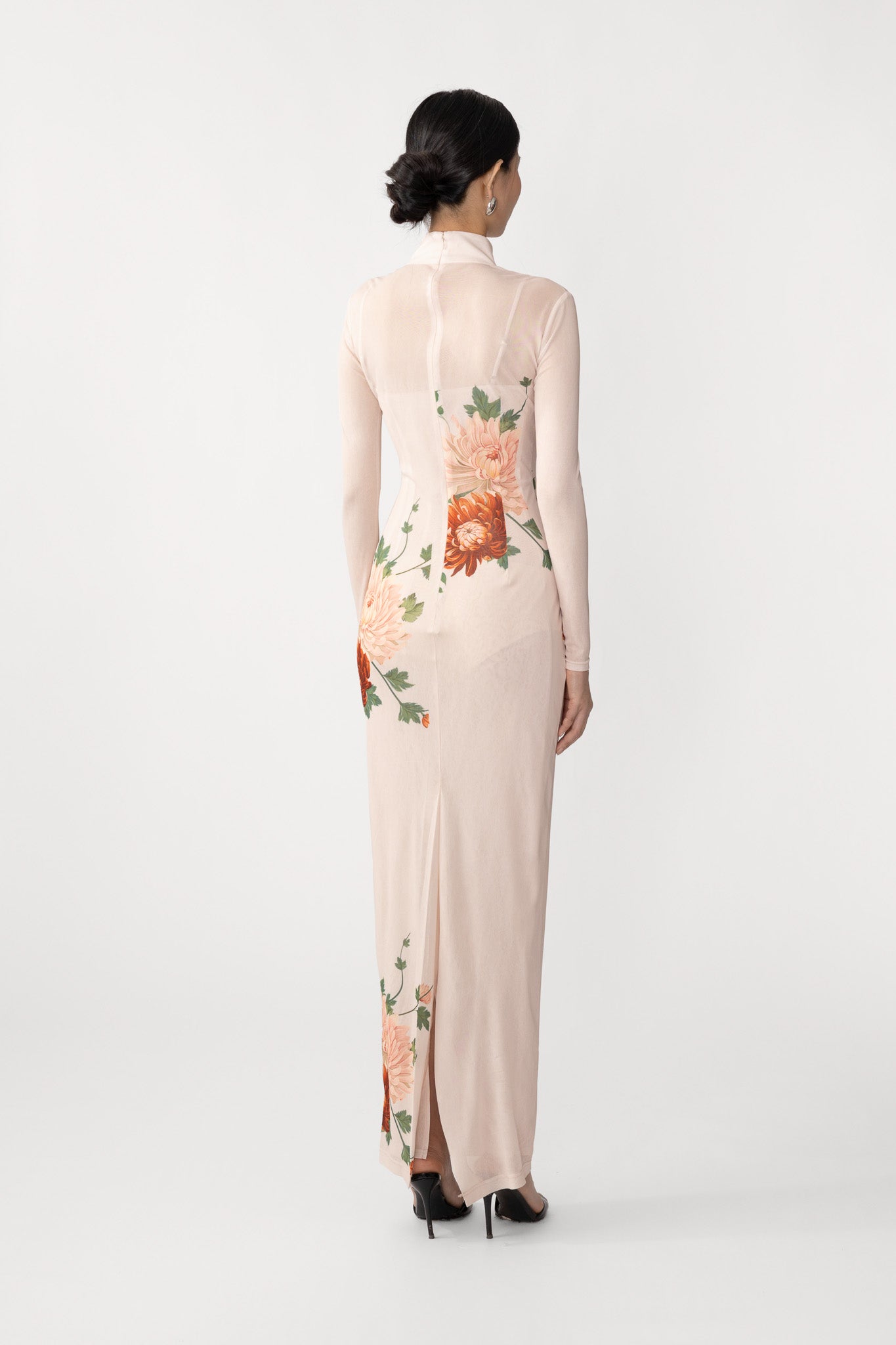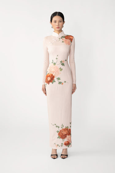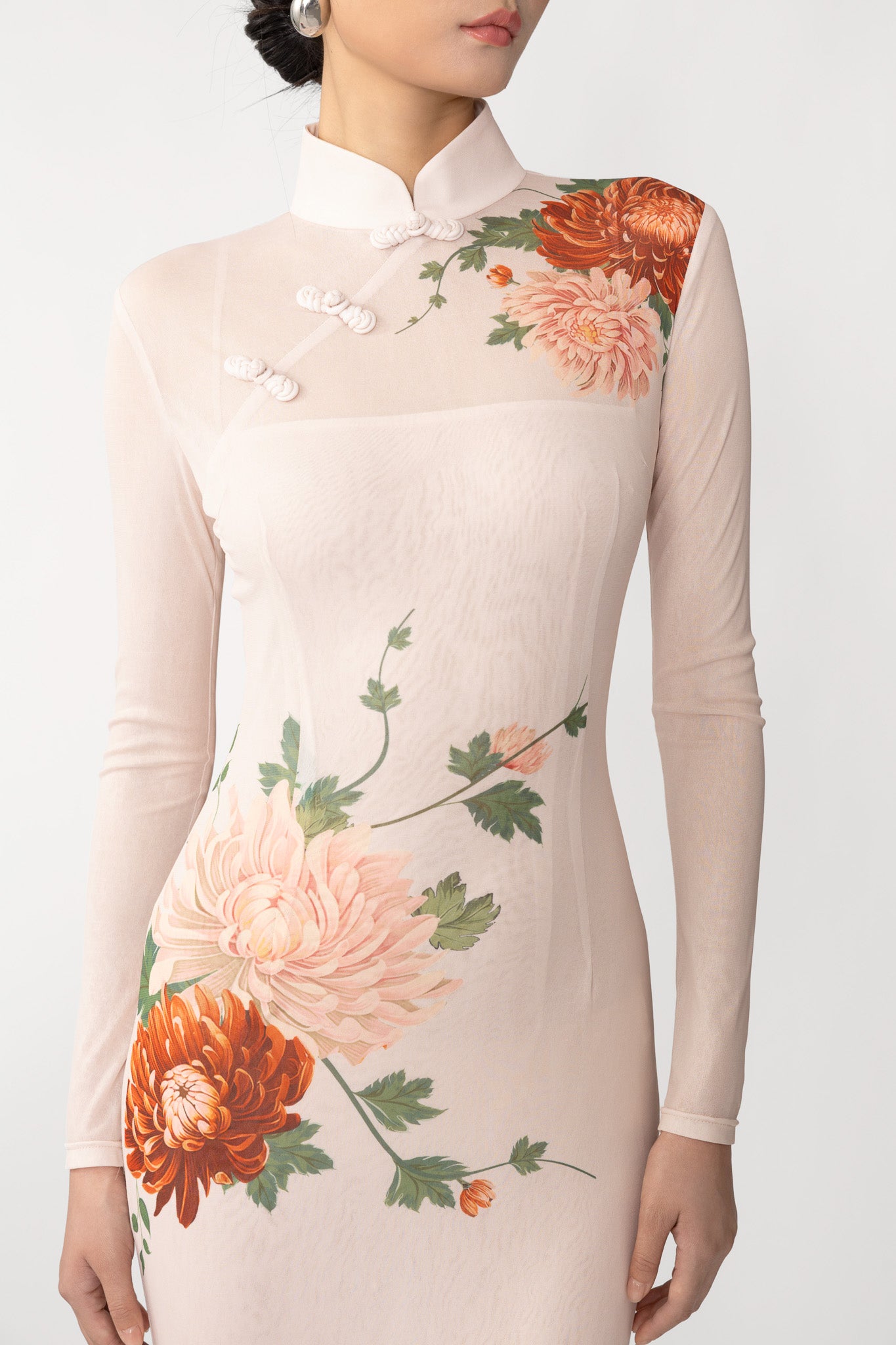 The Kaia Dress is a long-sleeve printed mesh modern cheongsam featuring an original chrysanthemum design, a signature mandarin collar, and pipa knot detailing. It comes with a slip for full coverage.