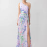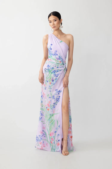 One-shoulder chiffon maxi dress with a thigh-high slit featuring a knot detail at the front