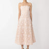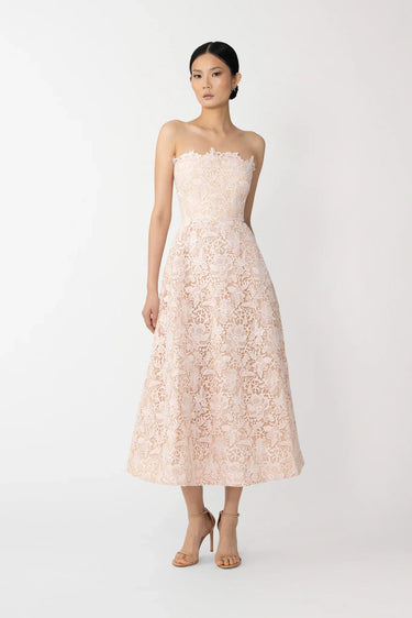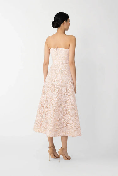 Lace midi dress with strapless scalloped neckline, fully-boned corset bodice, and romantic A-line fit skirt over nude lining