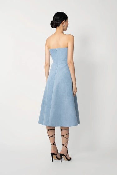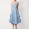 Denim midi fit-and-flare sundress with fully-boned bodice and signature pipa knot detail
