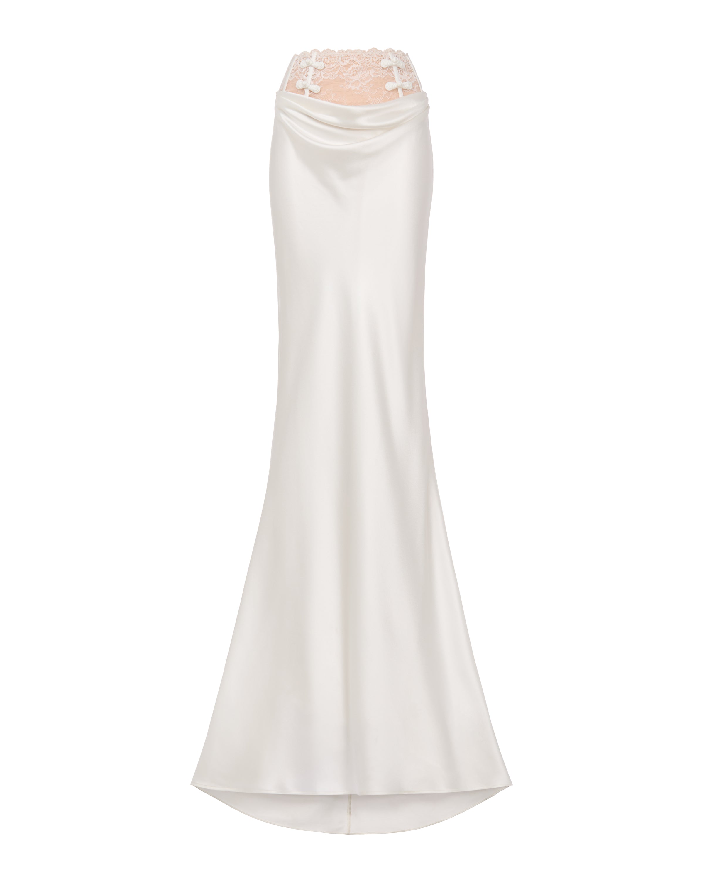 The Lila satin skirt is cut on the bias from luxurious satin fabric. This flowing, floor length silhouette features intricate chantilly lace detailing on the waistband, enhanced by boning for a structured fit. Hand-tied pipa knot details add a charming touch. Complete your look by pairing it with the Lila satin top.