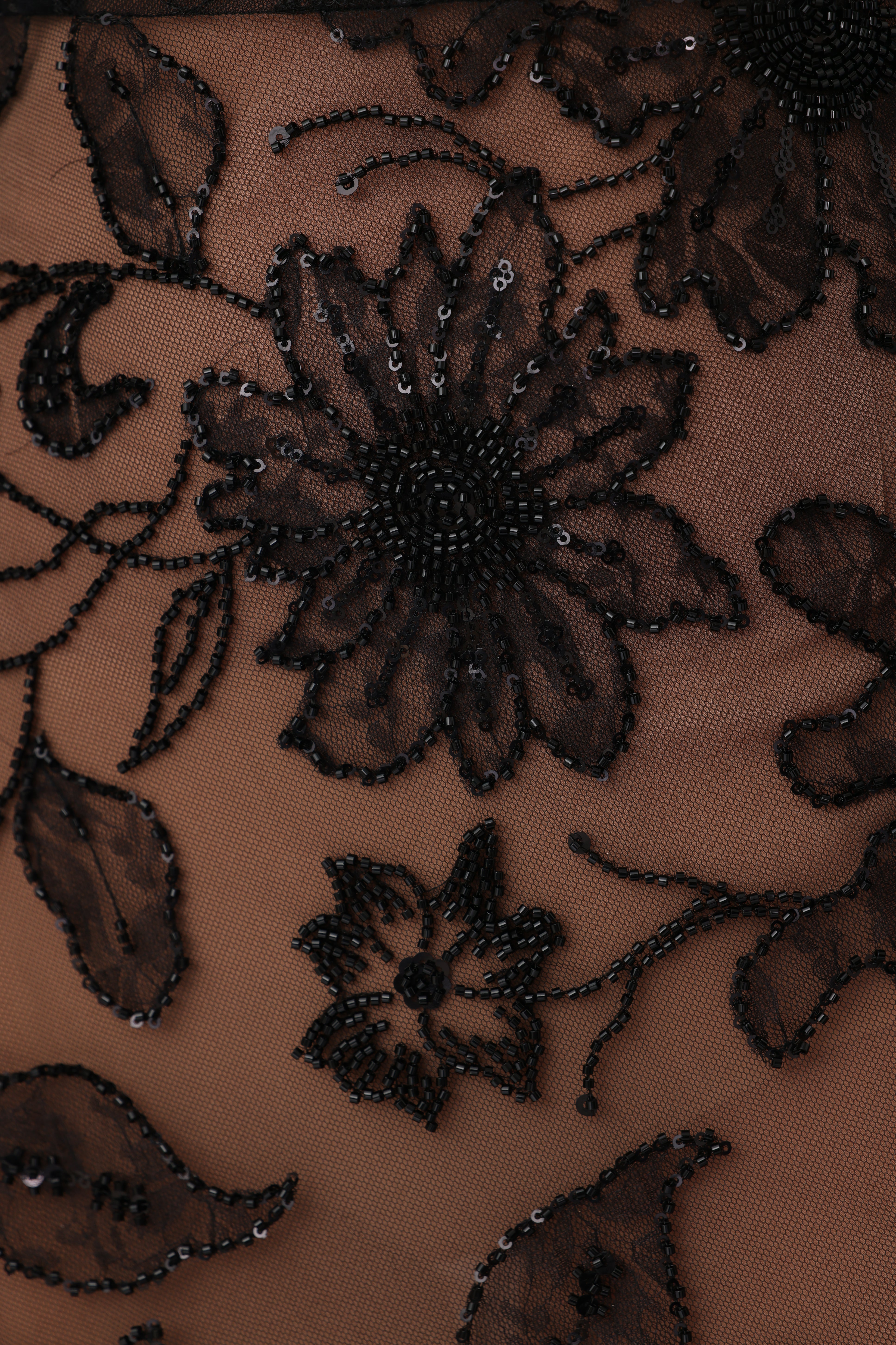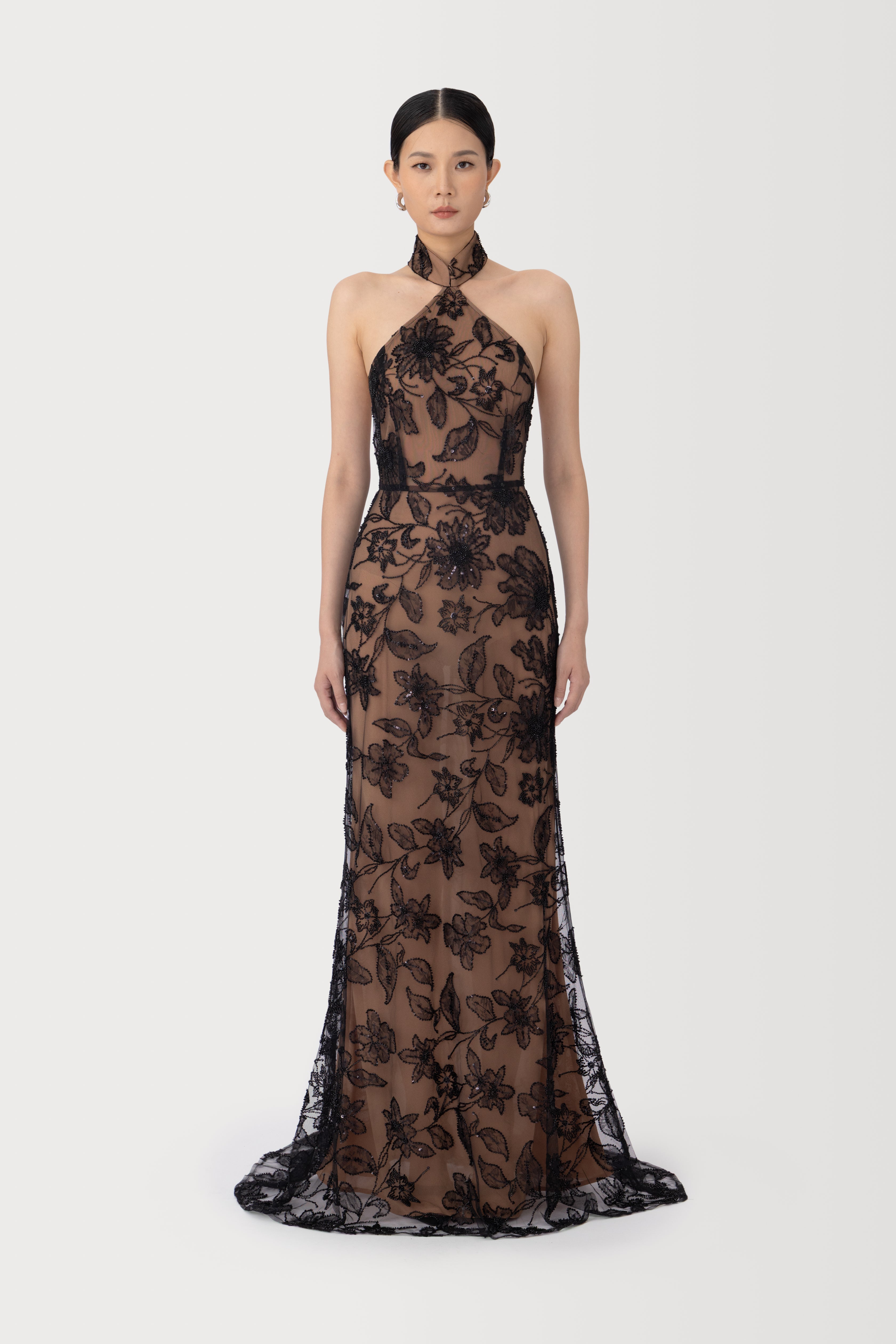 The Adelaide gown is a halter neck cheongsam inspired silhouette crafted from embellished floral lace mesh fabric adorned with delicate beads. This design features an hourglass shape that enhances the figure, complemented by a sensual open back.
