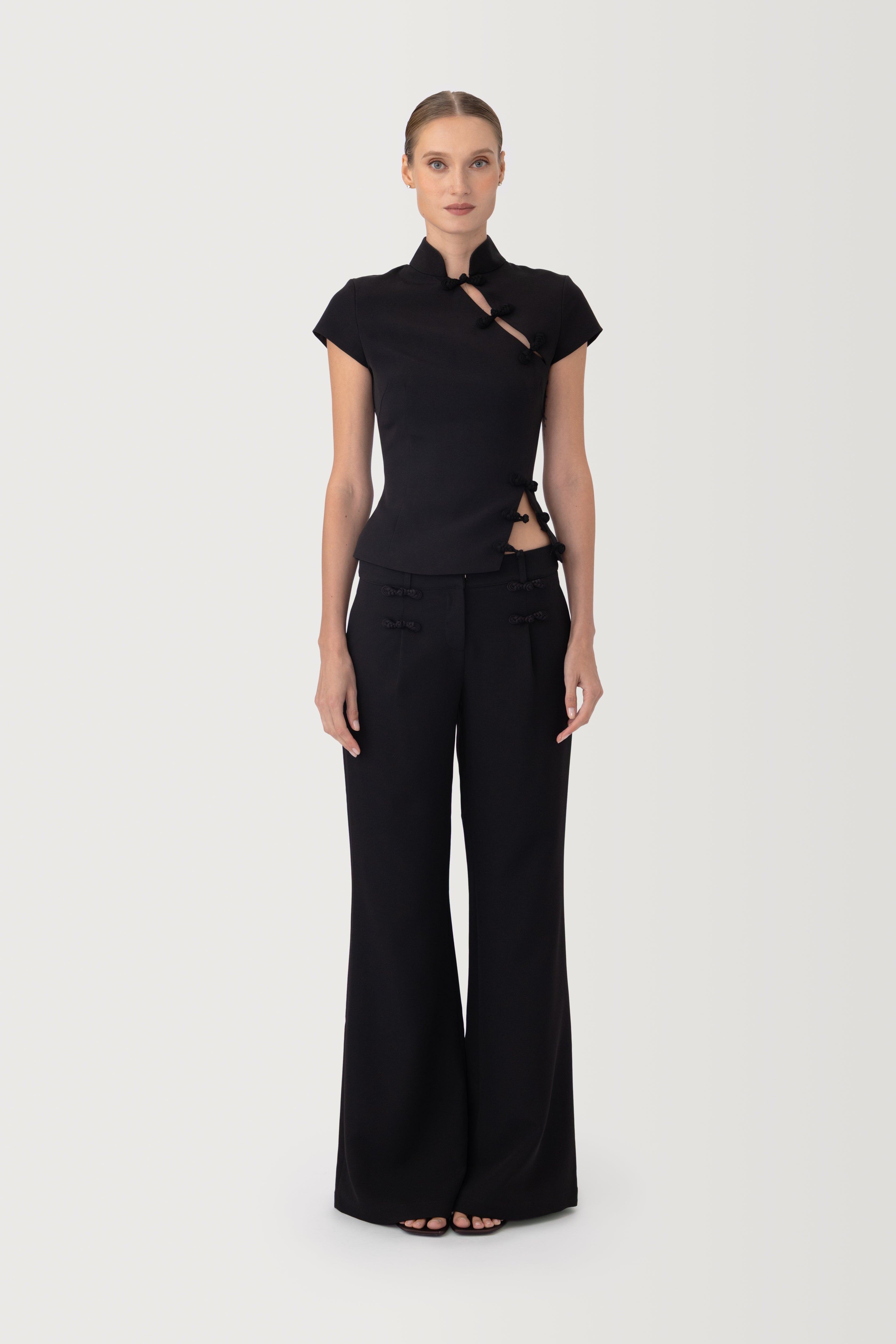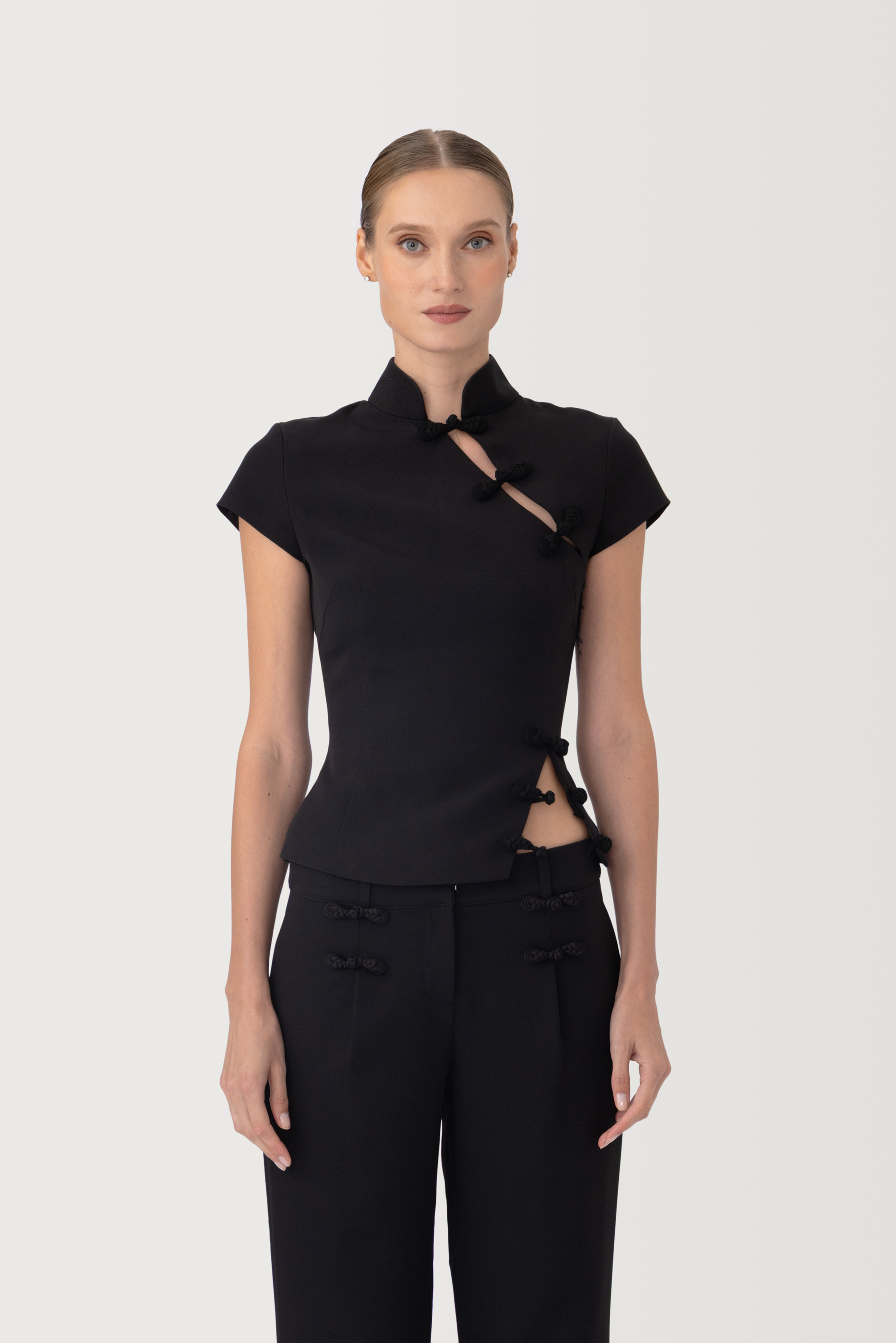The Iris crepe top is a cap sleeve cheongsam design in smooth crepe fabric. It features a mandarin collar and hand-tied pipa knot details for a distinctive look, with a front slit hem adding a contemporary touch. This top pairs seamlessly with the Soren pants.