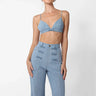 Denim bralette featuring signature hand-tied pipa knot detail, may be paired with Bambi denim jacket and Dylan denim pant