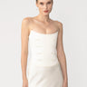 The Della Top is a modern strapless corset designed to sculpt an hourglass silhouette, with a sleek front bodice subtly adorned with signature hand-tied pipa knots. Pair it with the Dolly Skirt in matching glossy satin for timeless, understated romantic allure.