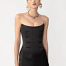 The Della Top is a modern strapless corset designed to sculpt an hourglass silhouette, with a sleek front bodice subtly adorned with signature hand-tied pipa knots. Pair it with the Dolly Skirt in matching glossy satin for timeless, understated romantic allure.