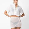 Soft knit button down sheer polo, box fit and cropped featuring signature pipa knots, may be worn as a bikini coverup with matching skirt