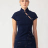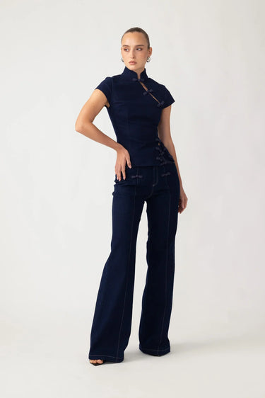 The Iris Denim Top is a fitted, cheongsam-inspired cut crafted from soft denim and finished with decorative hand-tied pipa knots.