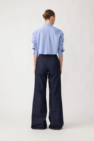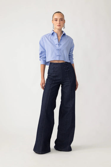 The Jonas Shirt is a cropped poplin button-up featuring a structured silhouette with hand-tied pipa knot closures—a must-have modern essential perfect for everyday occasions.
