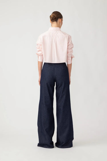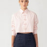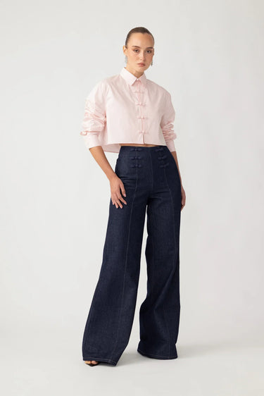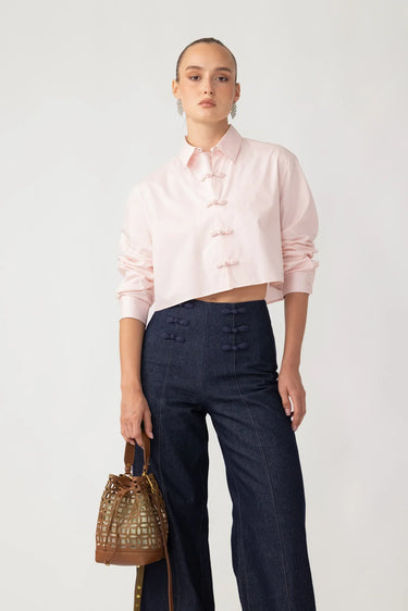 The Jonas Shirt is a cropped poplin button-up featuring a structured silhouette with hand-tied pipa knot closures—a must-have modern essential perfect for everyday occasions.