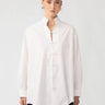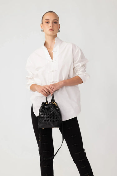 The Leo Shirt is a classic boyfriend-cut poplin button-up, featuring a mandarin collar and signature hand-tied pipa knot closures. This moderately oversized silhouette adds a touch of effortless flair to your all-about-town look.