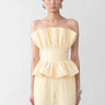 Crepe strapless top with a waist panel and ruffle feature. Pair with the Nicole Crepe Pant