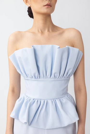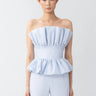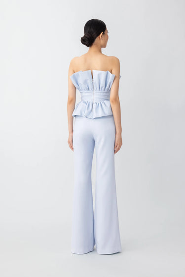 Crepe strapless top with a waist panel and ruffle feature. Pair with the Alex Pant