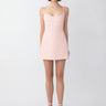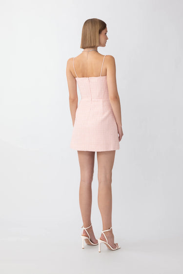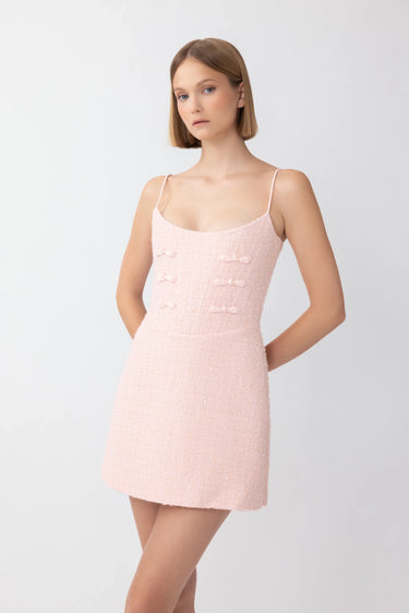 Tweed mini dress with a fully boned corset top featuring our hand-tied pipa knot button detail