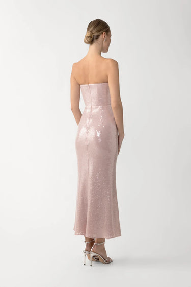 The Ciara Dress is a strapless party midi featuring a fully boned bodice and a figure-hugging skirt in all-over sequins designed to catch the eye.