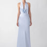 Halter satin gown in bias-cut fit with cowl neckline featuring elongated statement wings that drape from the back of the neck