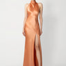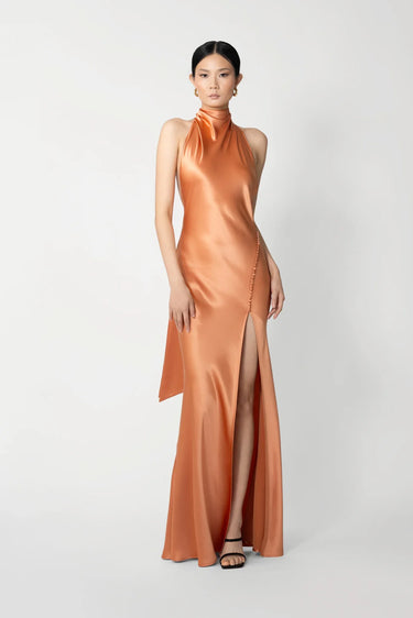 Penelope is our top bestseller that is guaranteed to make you feel effortlessly beautiful and captivating. A stunning bias-cut satin gown featuring a high neck, a low-cut back and open sides, a thigh-high side slit with covered button detail at the hip, and large statement wings at the back of the neck.