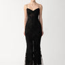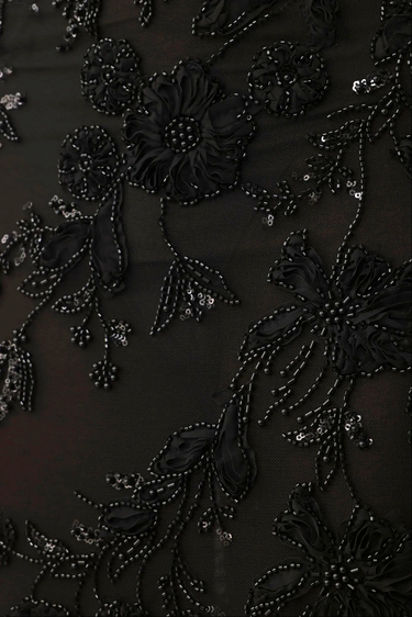 The Sammie Dress is crafted from sheer black mesh and embellished with tonal floral sequins. Featuring fine straps and a subtle mermaid silhouette, it’s a standout choice for cocktail hour.