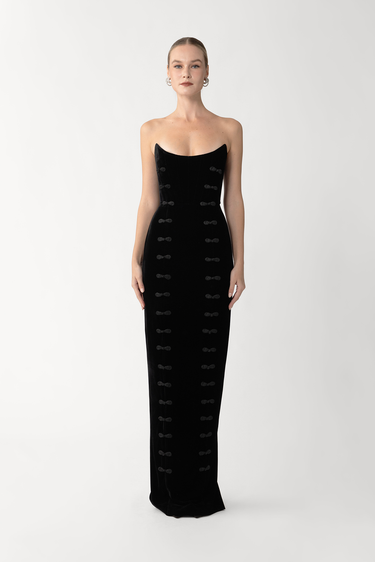 The Vesper Gown is a full-length silhouette in velvet, with hand-tied pipa knots tracing the front. A fully boned corset and fitted skirt sculpt the body with refined structure.