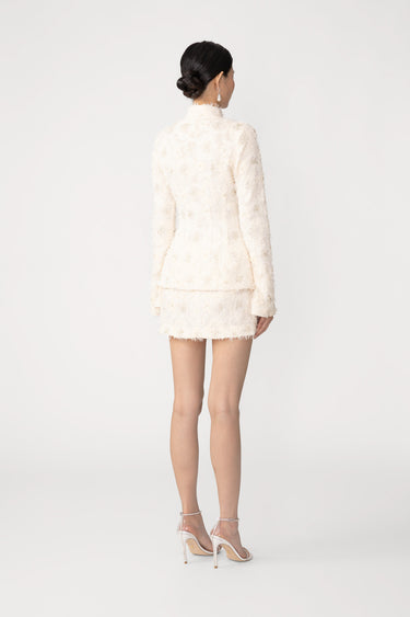 The Aja Skirt is a mid-waist knit mini crafted from a soft, fuzzy fabric and adorned with subtle crystal floral embroidery. It's the perfect styling piece to make a statement at parties or add a playful touch to everyday looks. Make it a set with the matching Aja Top.