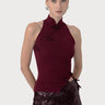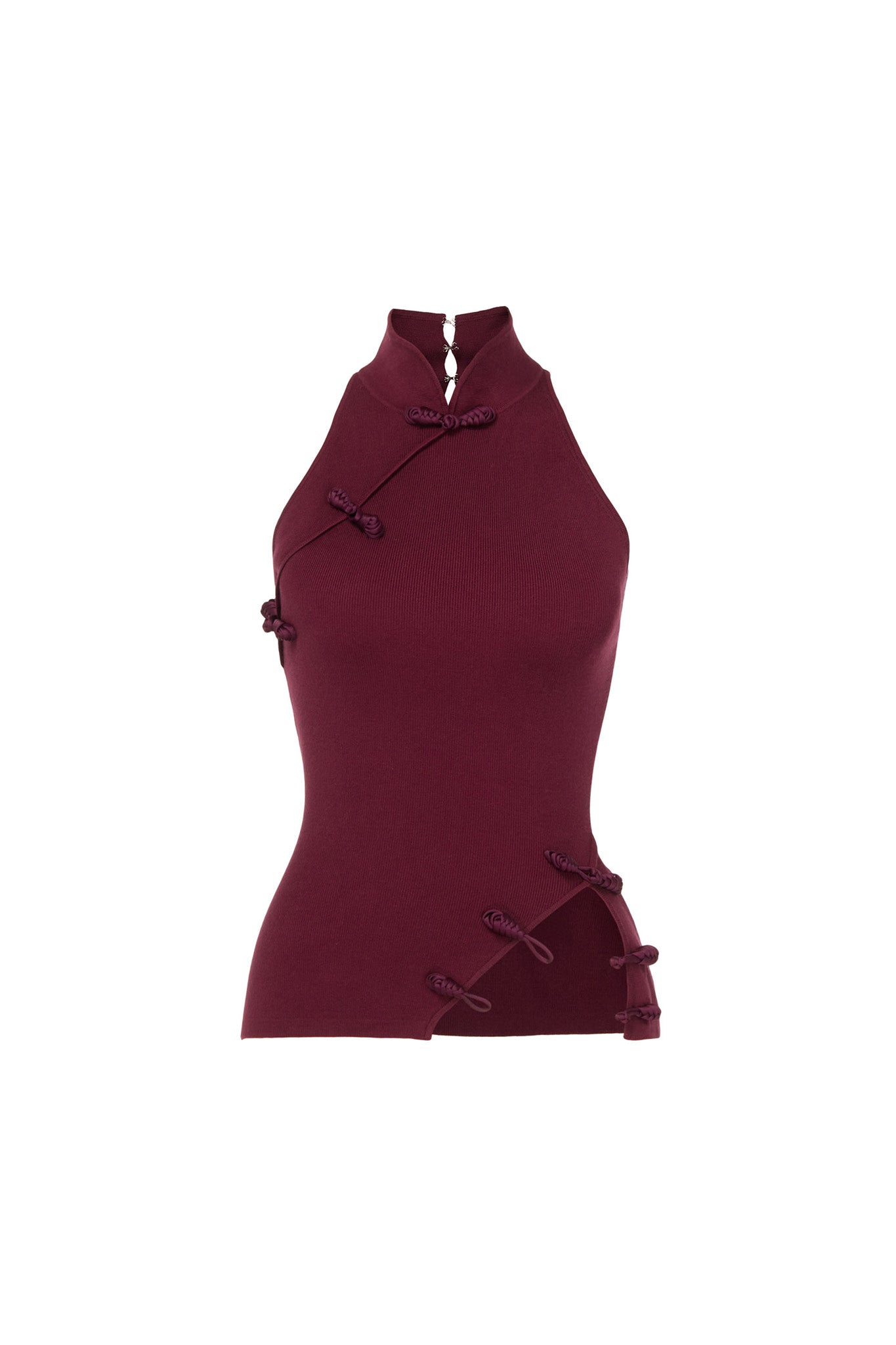 the Dunn Top is a sleeveless knit halter with a mandarin collar. Hand-tied pipa knots trace the neckline and slit hem for a signature finish. Pair with the Brooklyn Pant for an everyday look or style it up with the Venus Skirt for an evening affair.