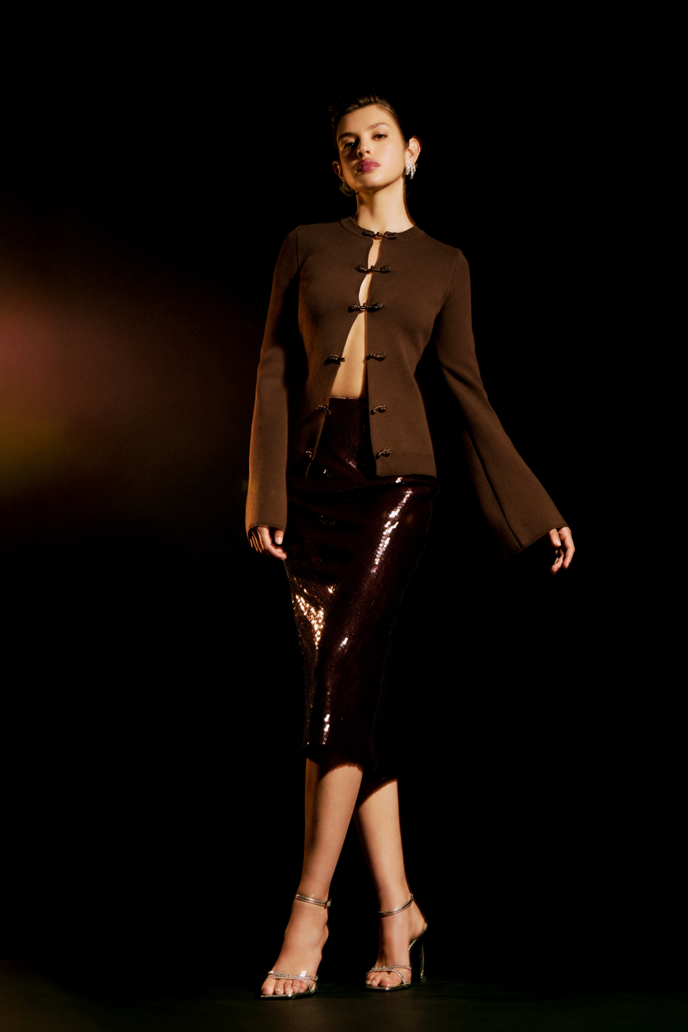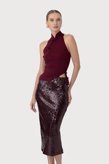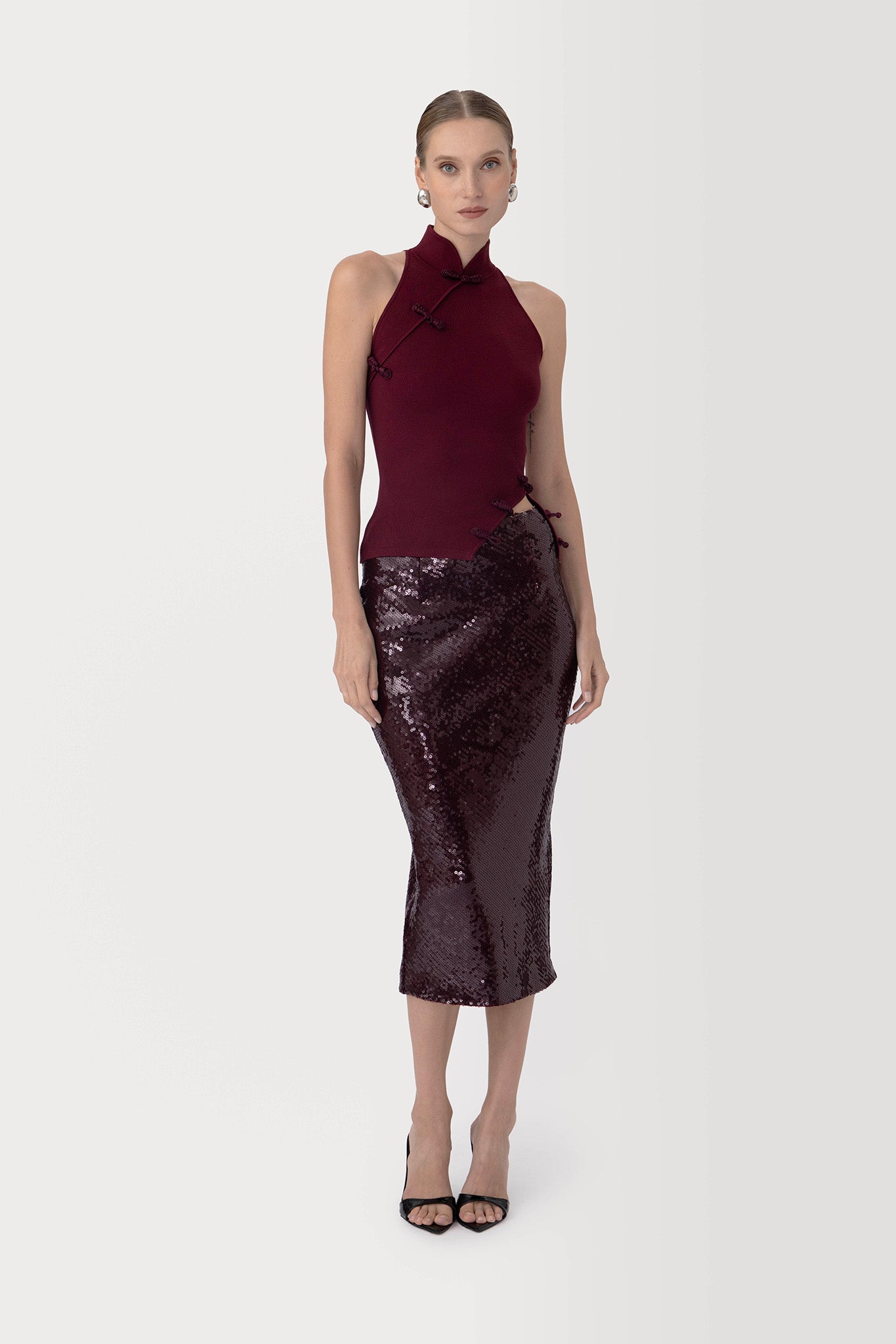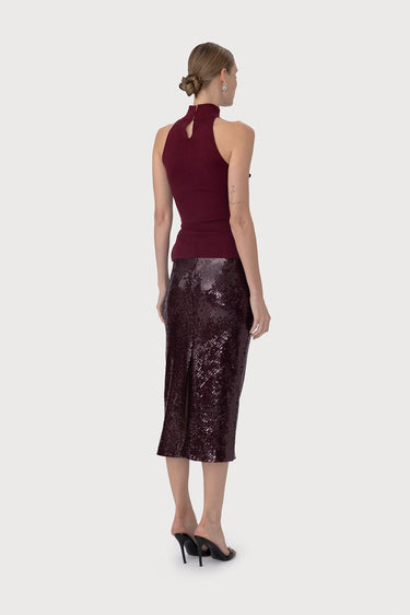 The Venus Skirt is a mid-waist midi length featuring densely sewn sequins with a slight stretch and back slit for effortless movement. The perfect styling piece for versatility for any party occasion.