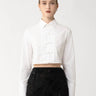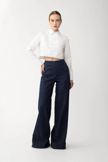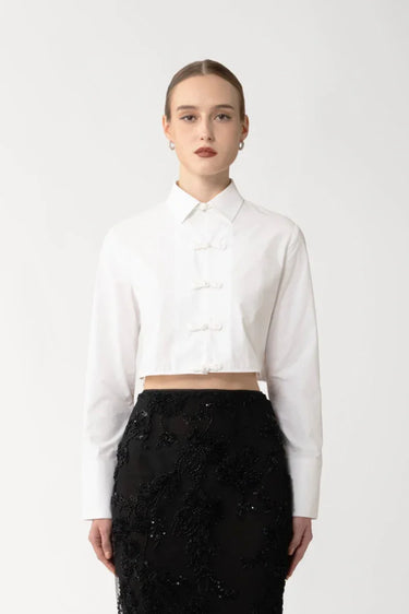 The Huxley Shirt is a cropped cotton silhouette with a structured fit and traditional collar. The open front is finished with hand-tied pipa knots—a timeless piece with sharp lines and minimal finish.
