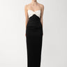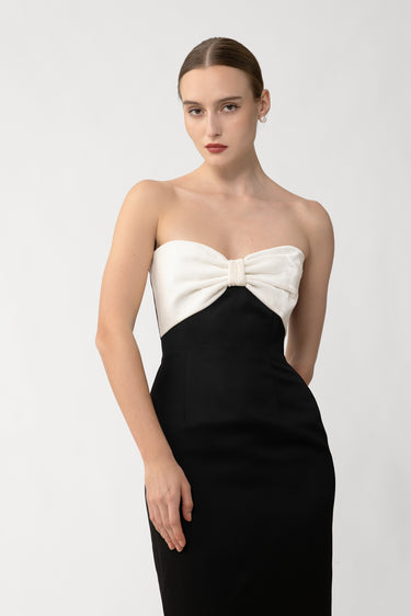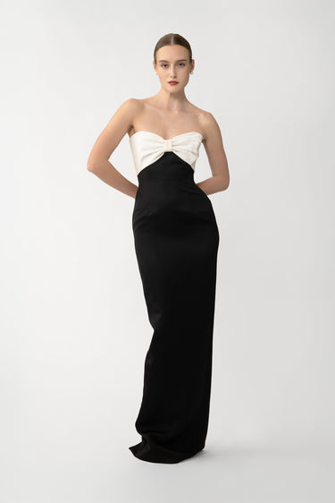 The Jaclyn Gown is a fitted column silhouette crafted in satin, featuring a contrast-color velvet bow-shaped bust that is perfect for evening occasions.